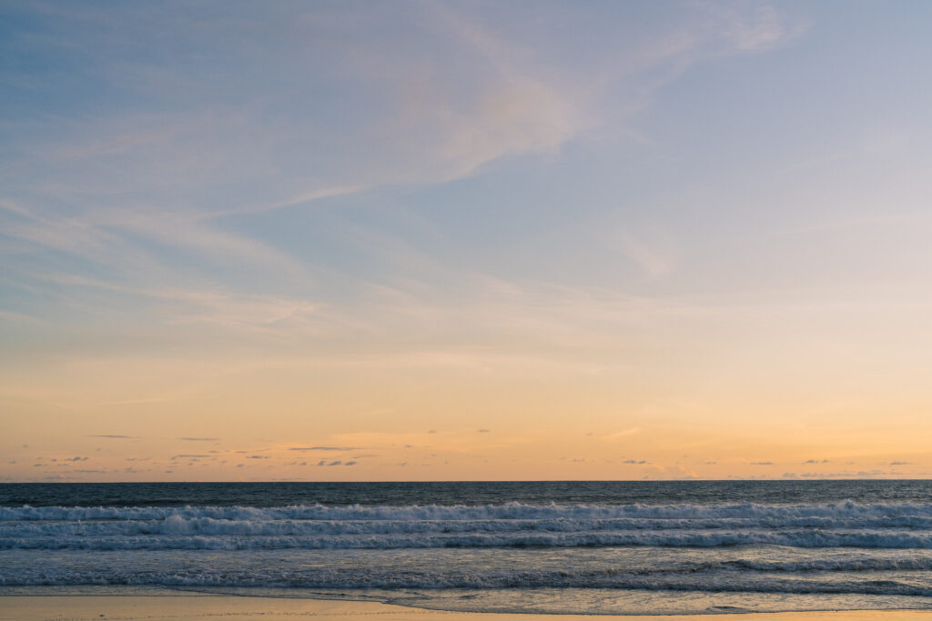 As the sun lowers, shadows stretch gently across the sand, and the ocean reflects a muted glow. This creates a cinematic atmosphere without needing any direction.
