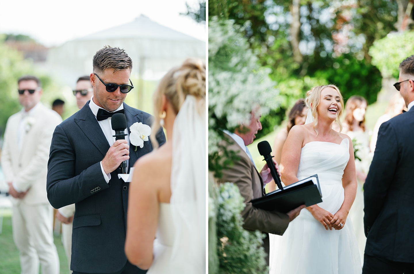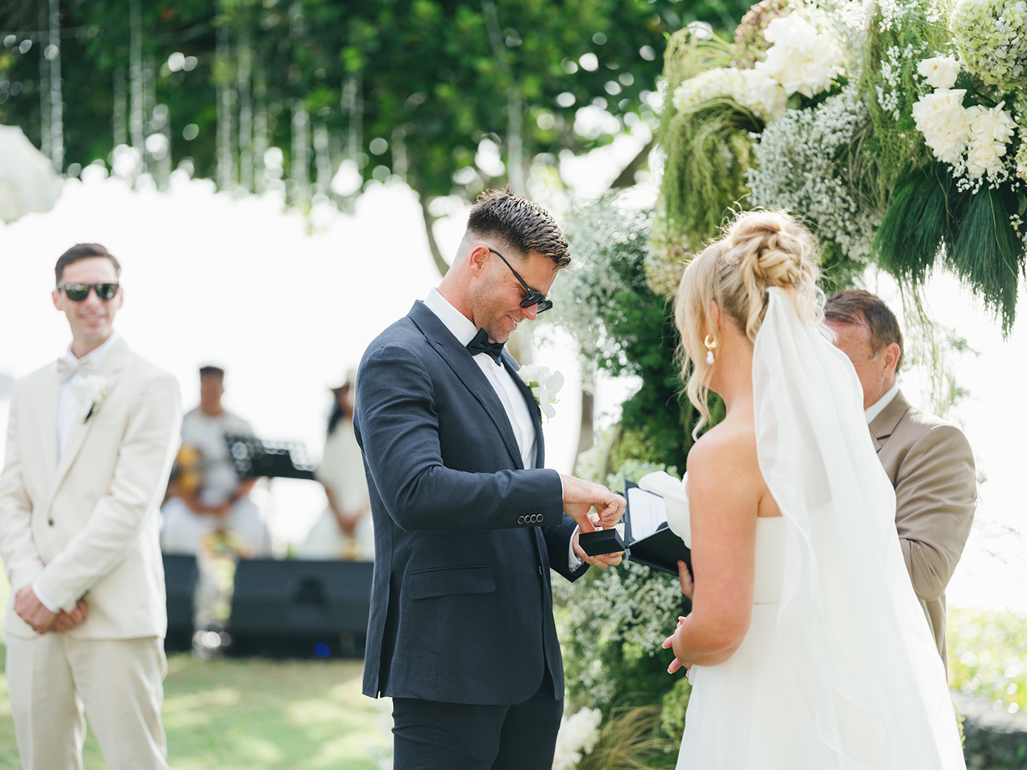 With the sea behind them and the afternoon light fading, vows were exchanged in a way that felt honest and unguarded. Nothing exaggerated, nothing rushed. Just words spoken sincerely, pauses held gently, and emotions that didn’t need to be announced to be understood.